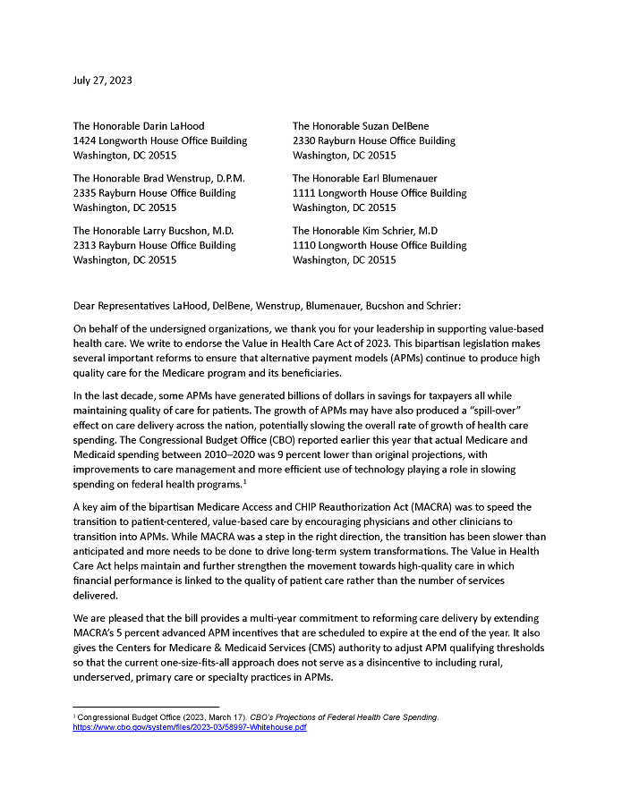 On behalf of the undersigned organizations, we thank you for your leadership in supporting value-based health care. We write to endorse the Value in Health Care Act of 2023. This bipartisan legislation makes several important reforms to ensure that alternative payment models (APMs) continue to produce high quality care for the Medicare program and its beneficiaries.