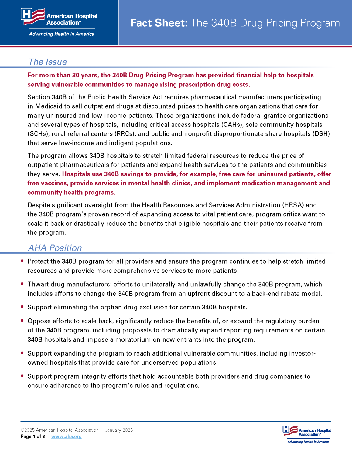 • 340B hospitals are committed to improving transparency. The AHA actively works with its 340B member hospitals on efforts to strengthen the 340B program by increasing transparency in the program and helping 340B hospitals communicate publicly the value the program brings to patients and communities — such as through the AHA Good Stewardship Principles and case studies published on the AHA website.