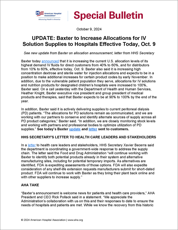 The AHA is continuing efforts on multiple fronts to provide updates and assist members related to the supply chain issues resulting from the closure of a Baxter manufacturing plant in North Carolina because of damage from Hurricane Helene. The plant manufactures approximately 60% — or 1.5 million bags — of the IV solutions used every day in the U.S. Visit our webpage for more information and resources.